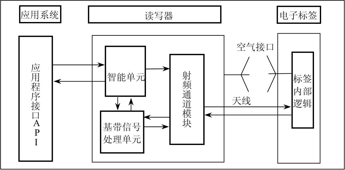 (2)读写器与后端应用系统之间的通信功能:读写器将读取到的标签信息传递给后端应用系统,而后端应用系统则对读写器进行控制与信息交互,完成特定的应用任务。