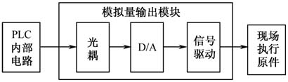 模拟量输出模块是把PLC输出的数字量经光电耦合器后,再经过D/A转换器后,将数字信号转换成模拟信号,经过运算放大器后驱动输出,该过程如图 1-17 所示。