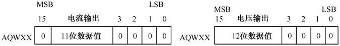 经PLC CPU模块处理后的 12 位数字输出格式如图 1-18 所示。模拟量输出数据字是左对齐的,最高有效位是符号位,0 表示正值。最低位是 4 个连续的 0,在将数据字装载到DAC寄存器之前,低位的 4 个 0 被截断,不会影响输出信号值。