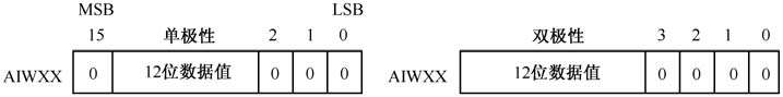 模拟量输入模块的输入信号经A/D转换后的二进制数在CPU中的存放格式如图 1-16 所示。模拟量转换为数字量的 12 位读数是左对齐的,MSB和LSB分别是最高有效位和最低有效位。最高有效位是符号位,0 表示正值,1 表示负值。在单极性格式中,最低位是 3 个连续的 0,相当于A/D转换值被乘以 8。在双极性格式中,最低位是4 个连续的 0,相当于A/D转换值被乘以 16。