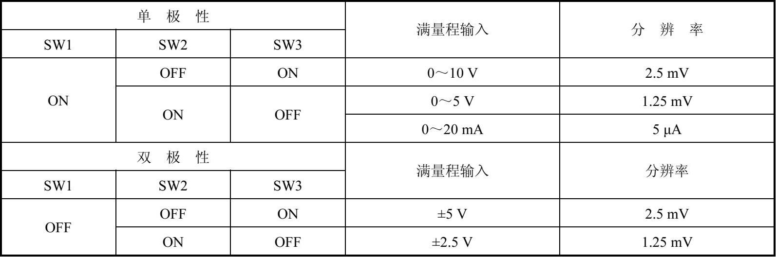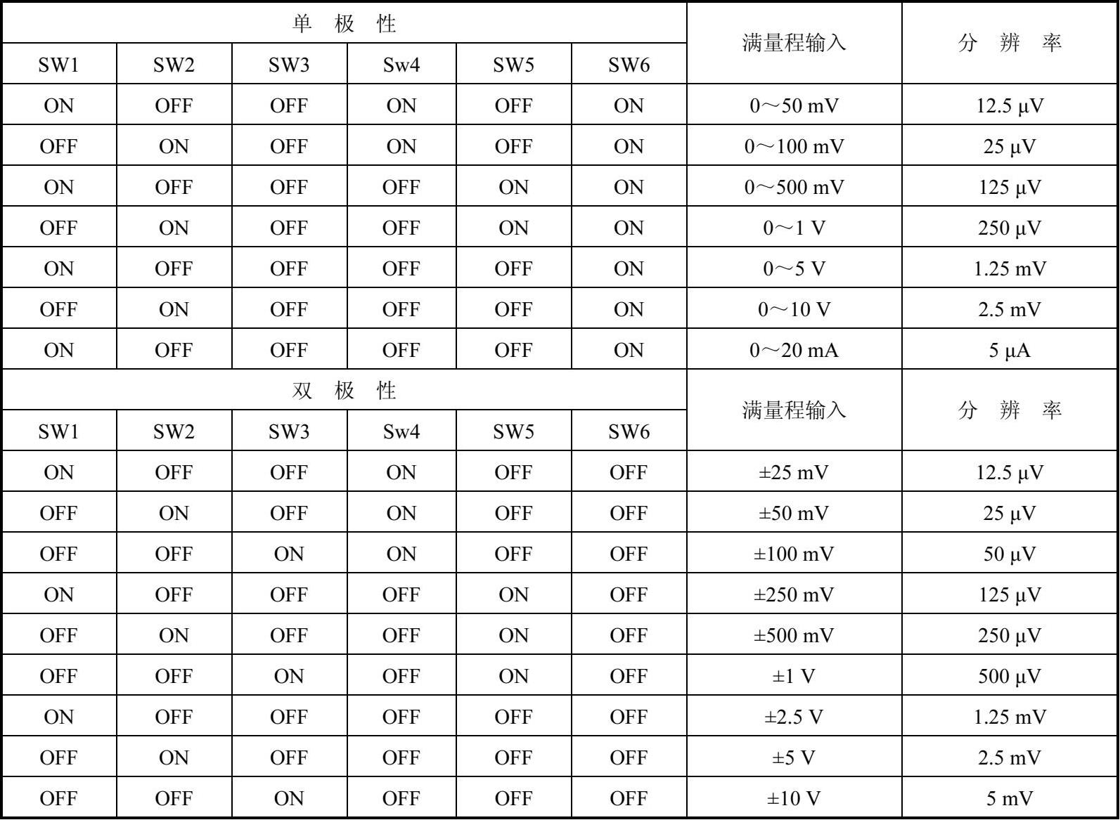 带正负号的电流或电压在A/D转换后用二进制补码表示。对于不同的输入,都应该设置硬跳线(拨码开关)或软跳线(参数设定)。模拟量输入模块有多种单极性、双极性直流电流、电压输入量程,可以用模块上的DIP开关来设置,见表 1-7 和表 1-8。