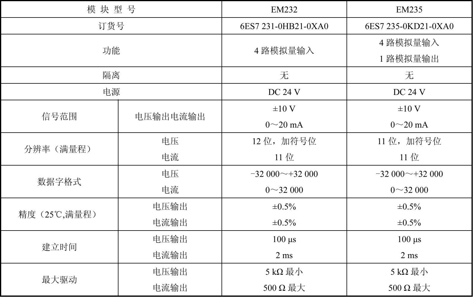 EM232 和EM235 模拟量输出模块的一些重要参数和说明如表 1-9 所示,其中包括用户在选型时最关心的量程、输入/输出电压范围和D/A转换时间等参数。