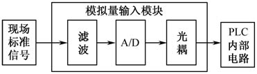 模拟量输入模块是把来自现场设备的标准信号,经过滤波去掉干扰信号后,再通过A/D转换,将模拟量信号变换成PLC能够处理的数字信号,然后经过光电耦合器隔离后传送给PLC内部电路,供PLC CPU处理。这一过程如图 1-15 所示。
