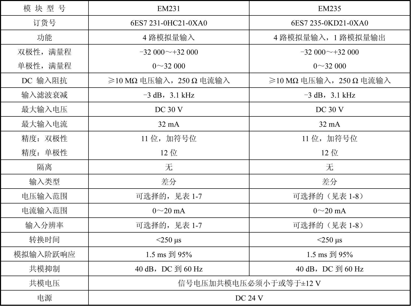 表 1-6 EM231 和EM235 模拟量输入模块重要参数及说明