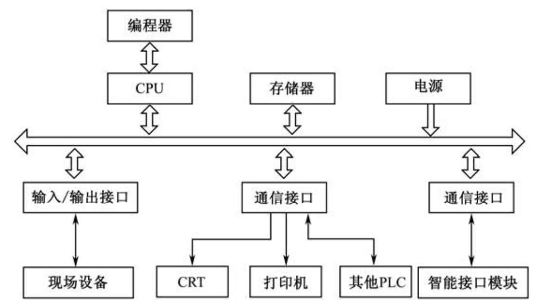 可编程序控制器是基于微处理器技术的通用工业自动化控制设备。它采用了计算机的设计思想,实际上就是一种特殊的工业控制专用计算机,只不过它的最主要的功能是数字逻辑控制。因此,PLC具有与通用的微型个人计算机相类似的硬件结构。PLC由中央处理器(CPU)、存储器、输入/输出接口、智能接口模块和编程器构成,其结构如图 1-2 所示。