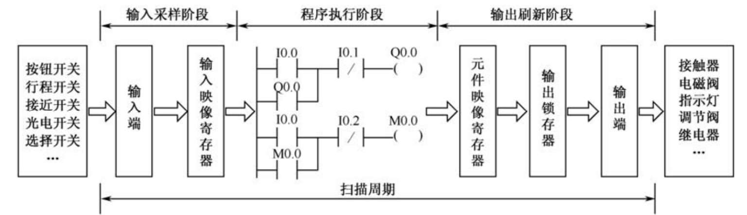 PLC执行程序有三个阶段:输入采样阶段、程序执行阶段和输出刷新阶段,如图 1-4 所示。