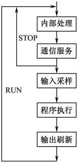 PLC的工作方式采用循环扫描,其扫描过程如图 1-3 所示。扫描时有两个状态:处于停止(STOP)状态时,只进行内部处理和通信操作服务等内容;处于运行(RUN)状态时,从内部处理、通信操作、程序输入、程序执行到程序输出,一直在循环扫描进行工作。