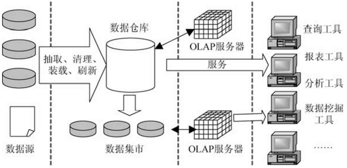 (3)数据仓库是非易失的、相对稳定的。数据仓库的数据主要供企业决策分析之用,所涉及的数据操作主要是数据查询,只有少量的修改和删除操作,通常只需定期加载、刷新。