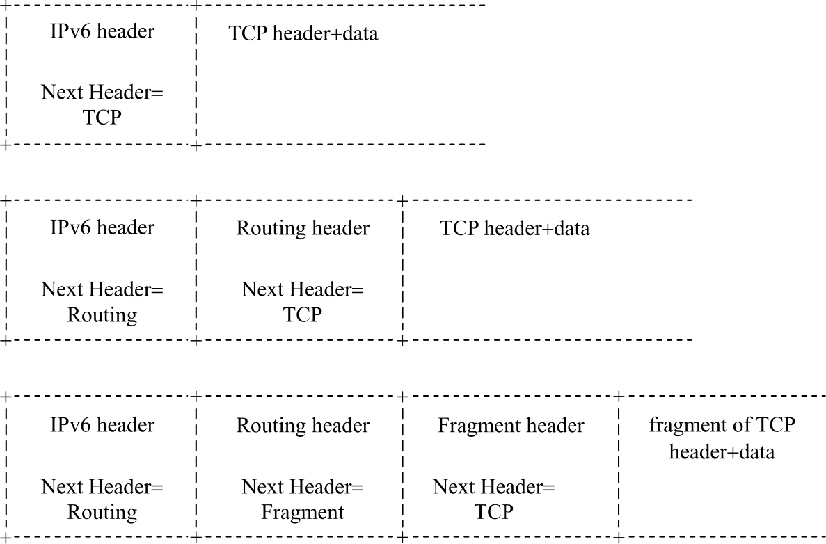 IPv4的有效负载(如TCP数据包)紧跟在IP报头之后。而IPv6的IP报头和有效负载之间可以插入任意数目的扩展报头。每个报头都用一个报头类型来标识,并携带链中下一个报头的类型。如果是最后一个扩展报头,则是有效负载的类型。图2-2所示的就是三个菊链式报头的例子。
