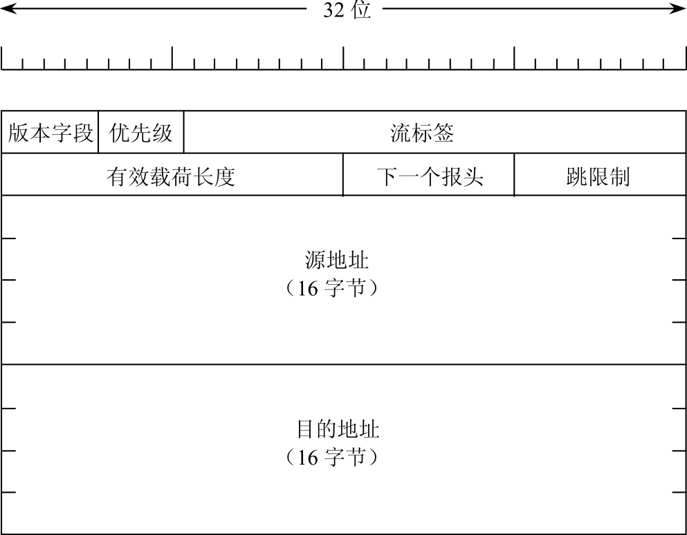 IPv6基础报头格式很简单,如图2-1所示,只有6个固定字段和2个地址字段。