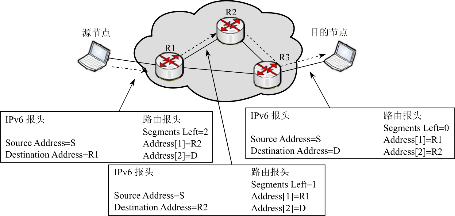 其作用与IPv4中的“源路由”选项相同,扩展头中携带了数据包需要途径的各节点的地址列表。在IPv4中,源节点指定的路由在选项报头字段中设置,使得所有的路由器都需要检查选项报头字段,即使它们并不是在这条路由上明确列出的中继节点,从而导致该类数据包的处理非常慢,目前已经很少使用。IPv6则对此进行了改进。路由器只在自己的地址在主报头的目的地址字段中出现时才需要检查路由选择报头,否则就可以不做额外处理,直接将数据包转发出去,这样就保证了较好的处理性能。