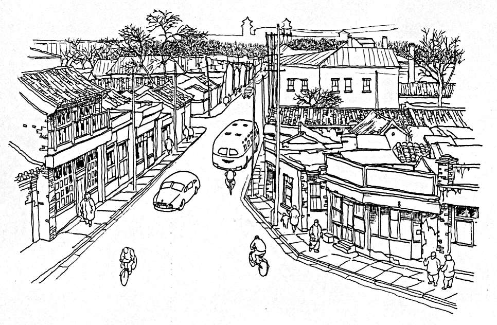 方巾巷这段街道长约300米左右。关于方巾巷的变迁,大概只有我们这些60岁以上的原住户才能说清。我原住的胡同,出门十几米便到方巾巷街。别看方巾巷这条街不长,其两侧店铺、住户相间并存。我记得,东侧自南往北大概依次是修自行车铺、水果店(一个山西人开的)、馒头铺、修自行车铺(与前面提到的那家车铺相距很近,但生意都很好,因为当时自行车、三轮车是主要交通工具)、理发馆,接下来是几家住户,其中一个门楼上刻有“观音堂”三个大字的大院内住着十几户人家,接下来依次是汉文斋文具店、祥源斋糕点铺、银行。西侧自南往北依次是糕点铺、油盐店、修自行车铺、炸丸子铺、玻璃铺、租小人书铺、棚铺、派出所、水店、宅院(宋庆龄副主席曾经的住宅)、晒图店、磨房、理发店。街不长,但很热闹。
