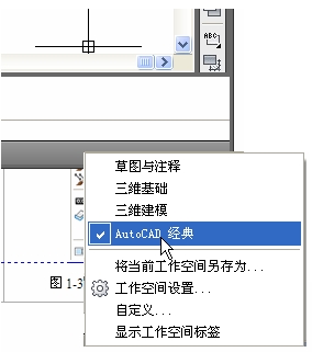 具体的转换方法:单击界面右下角的“初始设置工作空间”按钮,打开“工作空间”选择菜单,从中选择“AutoCAD经典”选项,如图1-2所示,系统转换到AutoCAD经典界面,如图1-3所示。