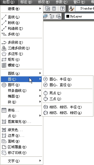 这种类型的命令后面带有子菜单。如单击菜单栏中的“绘图”菜单,指向其下拉菜单中的“圆”命令,屏幕上就会进一步弹出“圆”子菜单中所包含的命令,如图1-7所示。