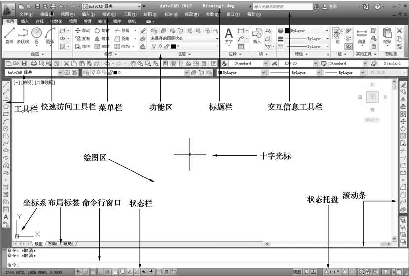 一个完整的AutoCAD经典操作界面包括标题栏、绘图区、十字光标、菜单栏、工具栏、坐标系图标、命令行、状态栏、布局标签和滚动条等。