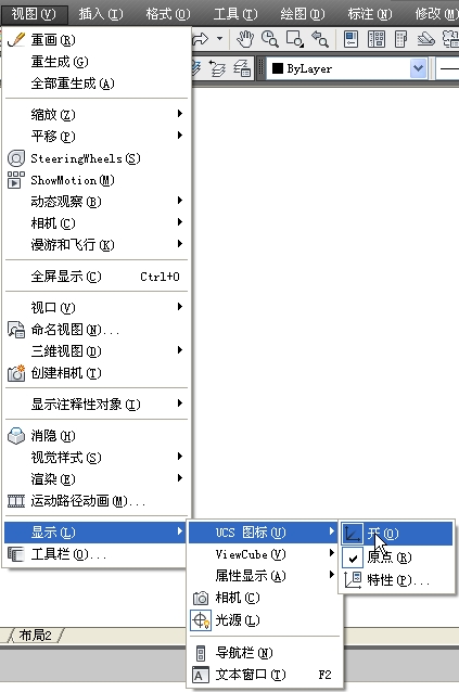 在绘图区域的左下角,有一个箭头指向图标,称为坐标系图标,表示用户绘图时正使用的坐标系形式,如图1-3所示。坐标系图标的作用是为点的坐标确定一个参照系。根据工作需要,用户可以选择将其关闭。方法是选择“视图”→“显示”→“UCS图标”→“ 开”,如图1-6所示。