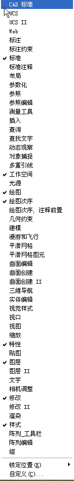 将光标放在工具栏的任一非标题区,单击鼠标右键,系统会自动打开单独的“工具栏标签”,如图1-13所示。用鼠标左键单击某一个未在界面显示的工具栏名,系统自动在界面打开该工具栏。反之,关闭工具栏。