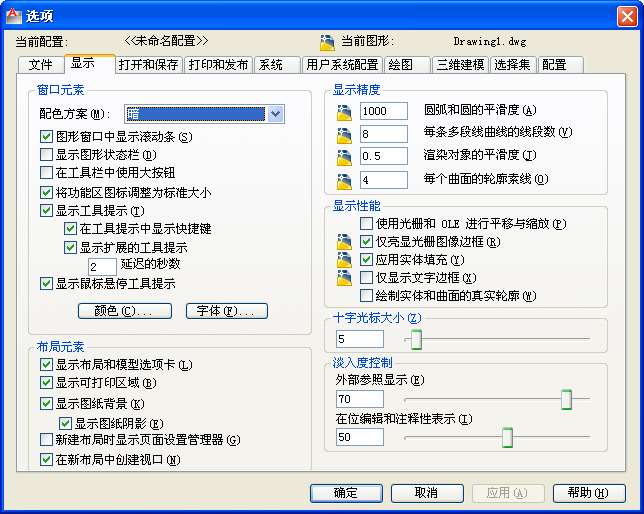 在绘图窗口中选择“工具”菜单中的“选项”命令,屏幕上将弹出系统配置对话框,打开“显示”选项卡,在“十字光标大小”区域的编辑框中直接输入数值,或者拖动编辑框后的滑块,即可以对十字光标的大小进行调整,如图1-4所示。