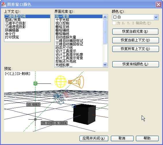 (1)如图1-4所示的选项卡中单击“窗口元素”区域中的“颜色”按钮,将打开如图1-5所示的“图形窗口颜色”对话框。