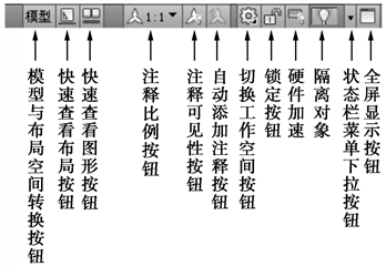 状态托盘包括一些常见的显示工具和注释工具,包括模型空间与布局空间转换工具,如图1-22所示,通过这些按钮可以控制图形或绘图区的状态。