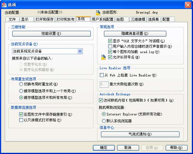 在“选项”对话框中的第5个选项卡为“系统”,如图1-27所示。该选项卡用来设置AutoCAD系统的相关特性。
