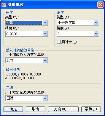 执行上述命令后,系统打开“图形单位”对话框,如图1-28所示。该对话框用于定义单位和角度格式。