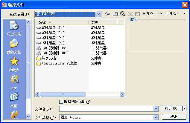执行上述命令后,打开“选择文件”对话框,如图1-33所示,在“文件类型”列表框中用户可选“.dwg”、“.dwt”、“.dxf”和“.dws”文件。“.dxf”文件是用文本形式存储的图形文件,能够被其他程序读取,许多第三方应用软件都支持这种格式。