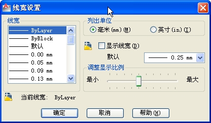 执行上述命令后,系统打开“线宽设置”对话框,如图1-53所示。该对话框的使用方法与图1-50所示的“线宽”对话框类似。
