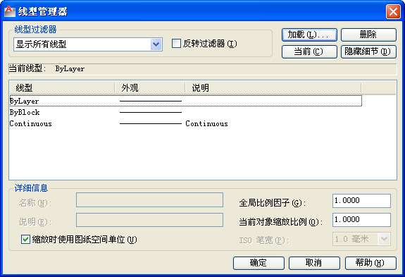 执行上述命令后,系统打开“线型管理器”对话框,如图1-52所示。该对话框的使用方法与图1-48所示的“选择线型”对话框类似。