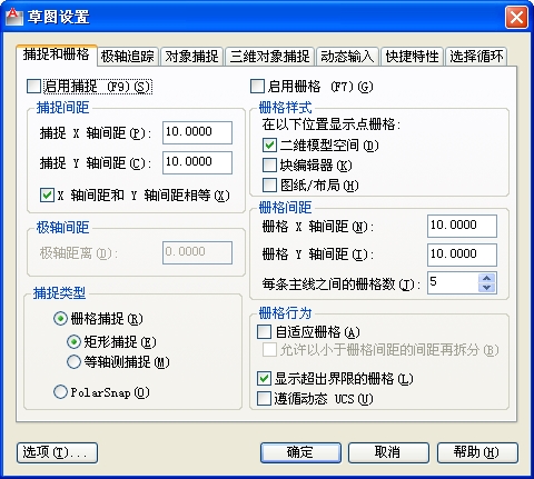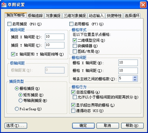 另外,可以使用GRID命令通过命令行方式设置栅格,功能与“草图设置”对话框类似,不再赘述。