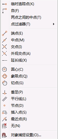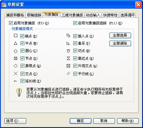 我们可以设置自己经常要用的捕捉方式。一旦设置了运行捕捉方式后,在每次运行时,所设定的目标捕捉方式就会被激活,而不是仅对一次选择有效。当同时使用多种方式时,系统将捕捉距光标最近、同时又是满足多种目标捕捉方式之一的点。当光标距要获取的点非常近时,按下 Shift 键将暂时不获取对象点。