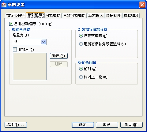 (4)极轴角测量。用于设置极轴角的角度测量采用的参考基准,“绝对”是相对水平方向逆时针测量,“相对上一段”则是以上一段对象为基准进行测量。