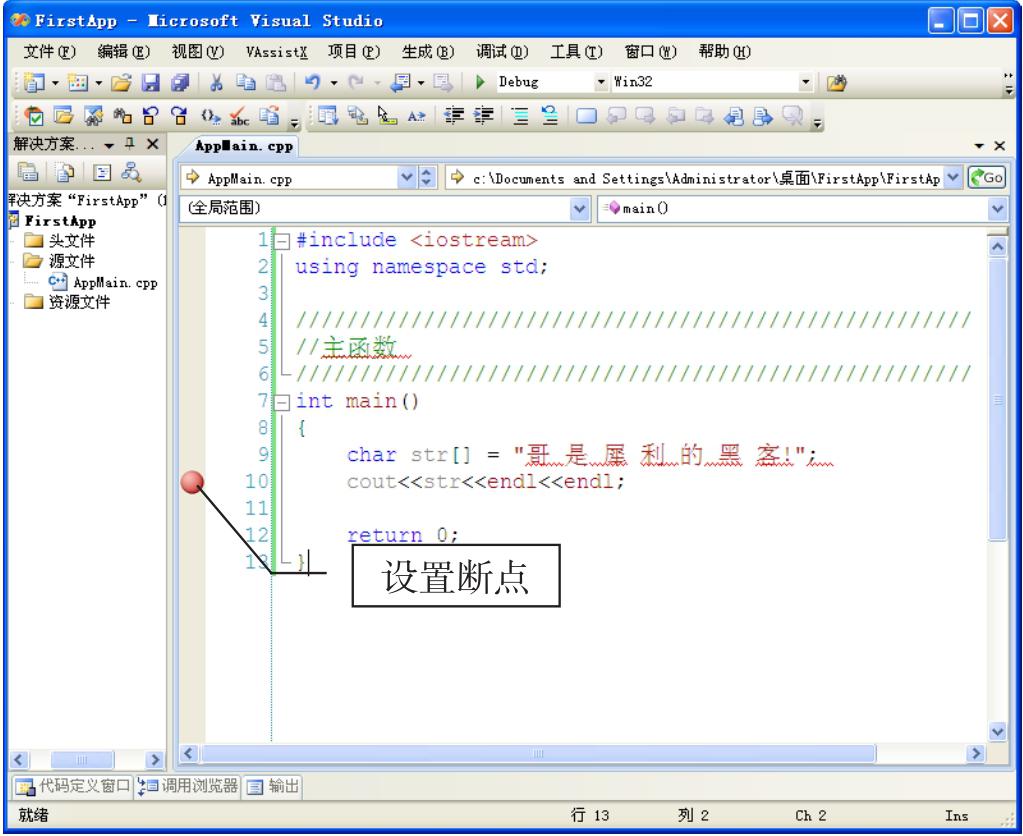 所谓断点,就是在程序中使调试器暂停执行的位置。在程序中可以设置多个断点,这样程序就可以在你认为可能有错误的范围处停止,然后从断点处开始进行单步执行,并同时查看各变量的值,从而揪出错误。在源代码中设置断点的方法有几种,例如,将光标停留在要设置断点的语句行,然后单击菜单栏的“调试”菜单项,单击“切换断点”命令或者按快捷键“F9”即可设置断点。是不是有点复杂,将军别急,还有种更方便的办法,如图2.13所示,你可以看到,语句行左边有一条纵向的灰色栏,上面有3个红色的圆点,这也是断点,你只需要在那条灰色栏上单击就可以在需要的地方设置断点。那个红色的圆点符号也称为图示符,它所在的地方表明该语句是一个断点,用同样的操作可取消断点。