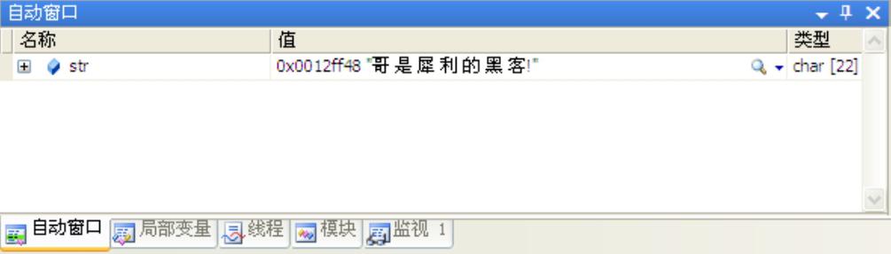 将军可以看到,该窗格显示了当前语句及相关的前一条语句正在使用的自动变量的值。另外,你还可查看“局部变量”、“线程”、“模块”、“监视1”等多种信息窗格。