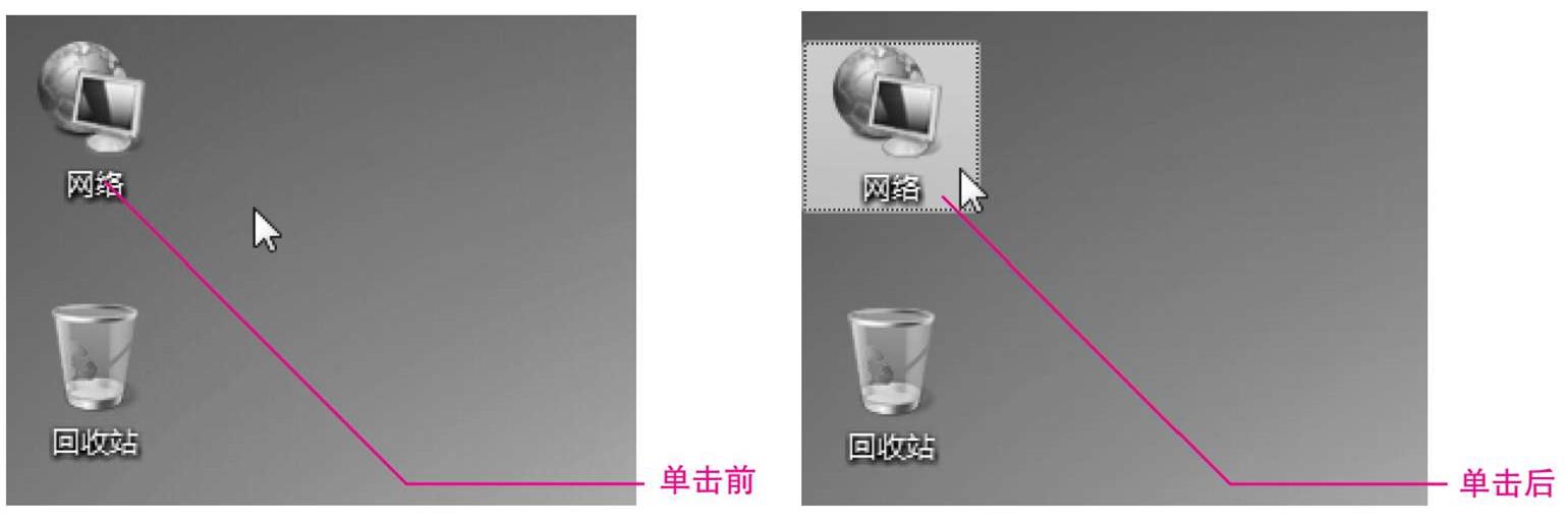 单击是指将鼠标指针指向某个对象后,食指按一下鼠标左键,然后立即松开。单击是使用频率最高的鼠标操作,通常用于选中对象、单击命令按钮或在文本中定位光标等操作,如图1.27所示。