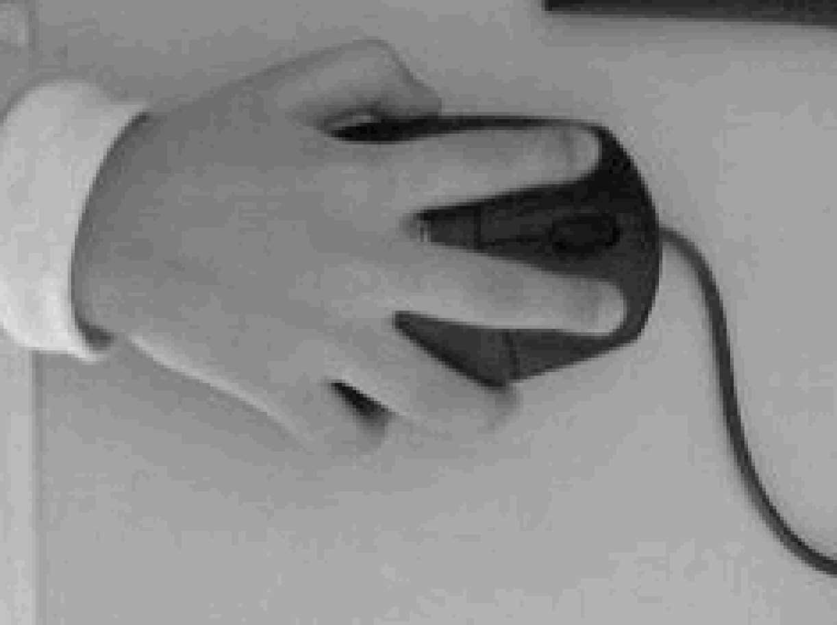 为了提高使用效率,我们应正确掌握使用鼠标的握姿。握鼠标的正确方法为:右手食指和中指分别轻放于鼠标的左、右键上,拇指的指腹轻贴于鼠标左侧,无名指和小指轻放于鼠标右侧,整个手掌轻轻握住鼠标,掌心轻轻贴住鼠标后部,手腕自然垂放在桌面上。移动鼠标时拇指、无名指和小指轻轻握住鼠标,同时手腕运动。