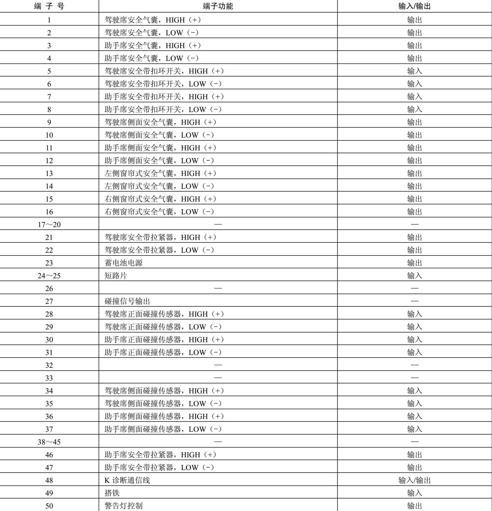表1-17 安全气囊系统电控单元(SRS)连接器端子功能 0cYKCHF65Krx7lRpfLMWd1+yeH44u8wOT36WtMYQ7RWtm42Nmchl1yp9oCA/2rS0