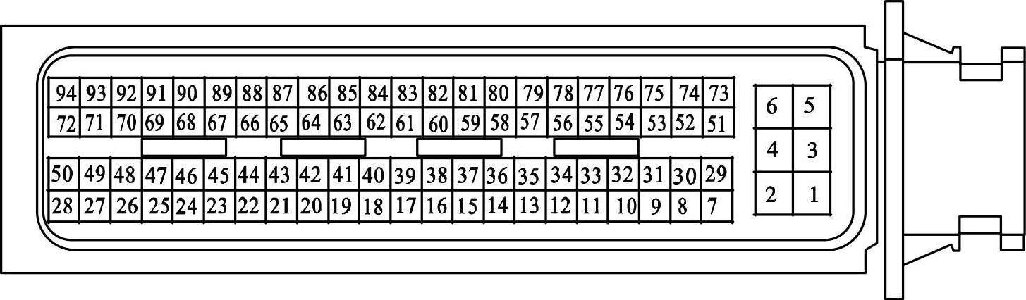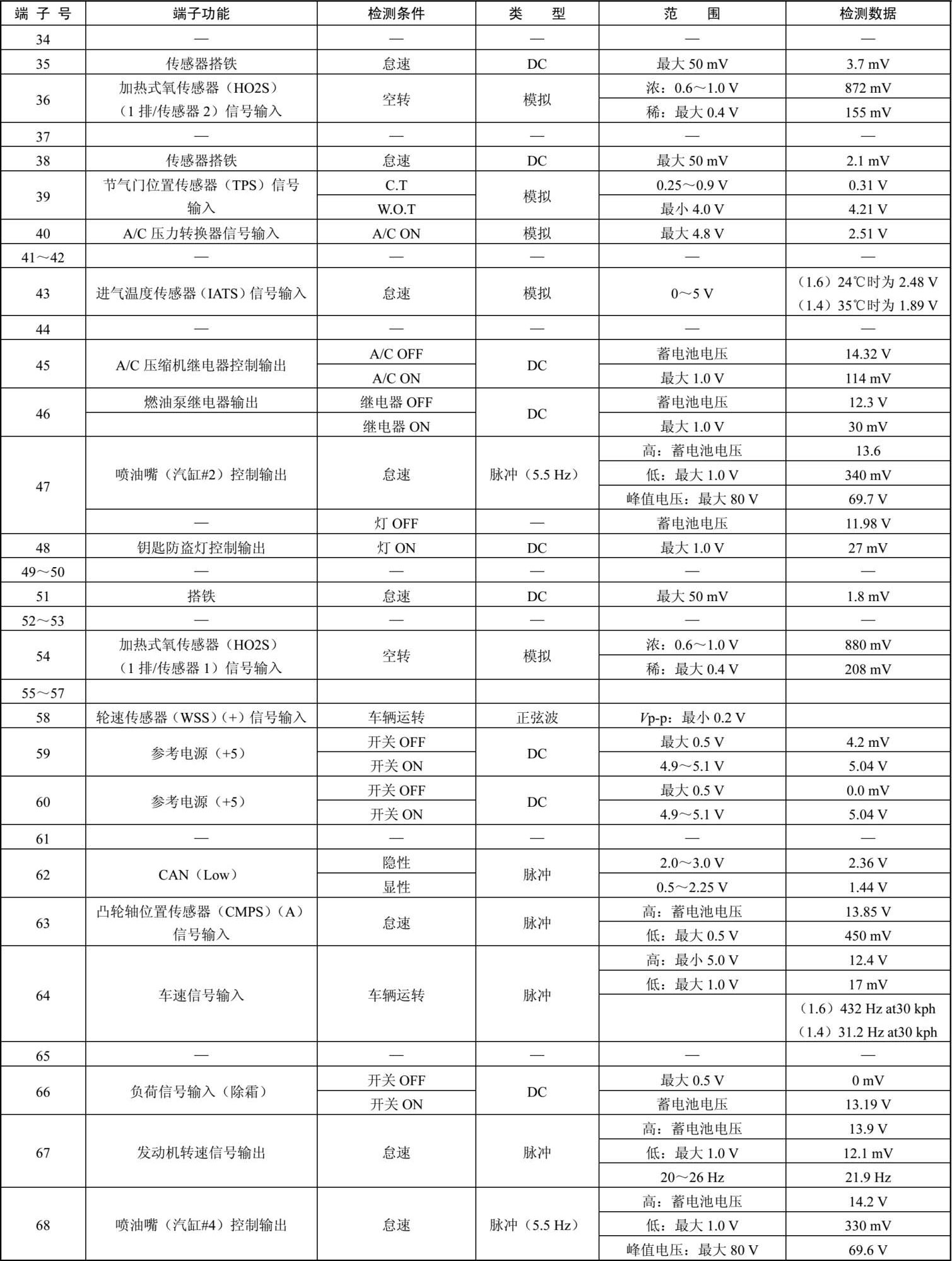 G4EE—GSL1.4和G4ED—GSL1.6发动机系统电控单元(M/T)线束连接器(C01—1)如图1-14所示,其端子功能和检测数据如表1-21所示。