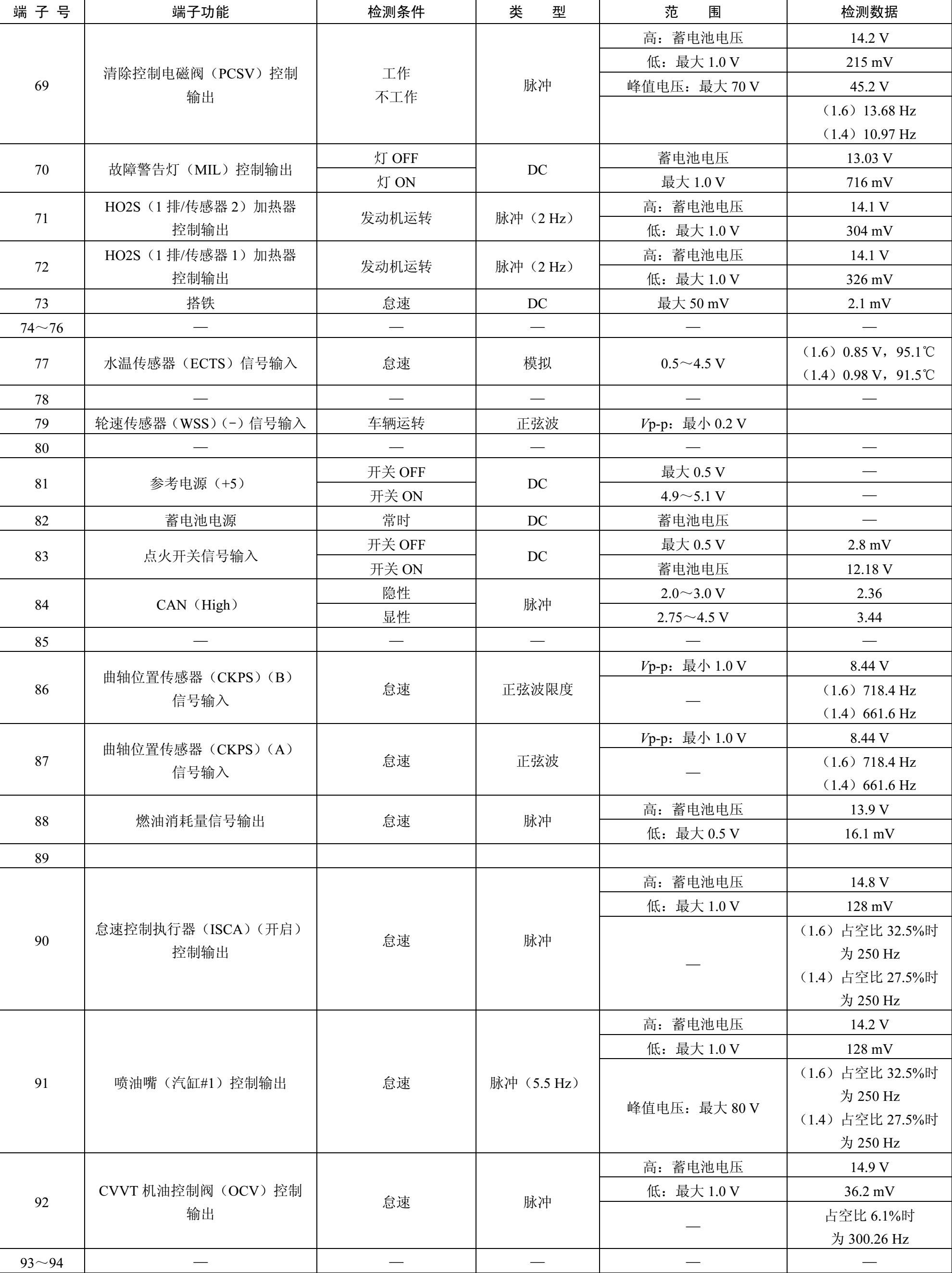 表1-21 发动机系统电控单元(M/T)线束连接器端子功能和检测数据