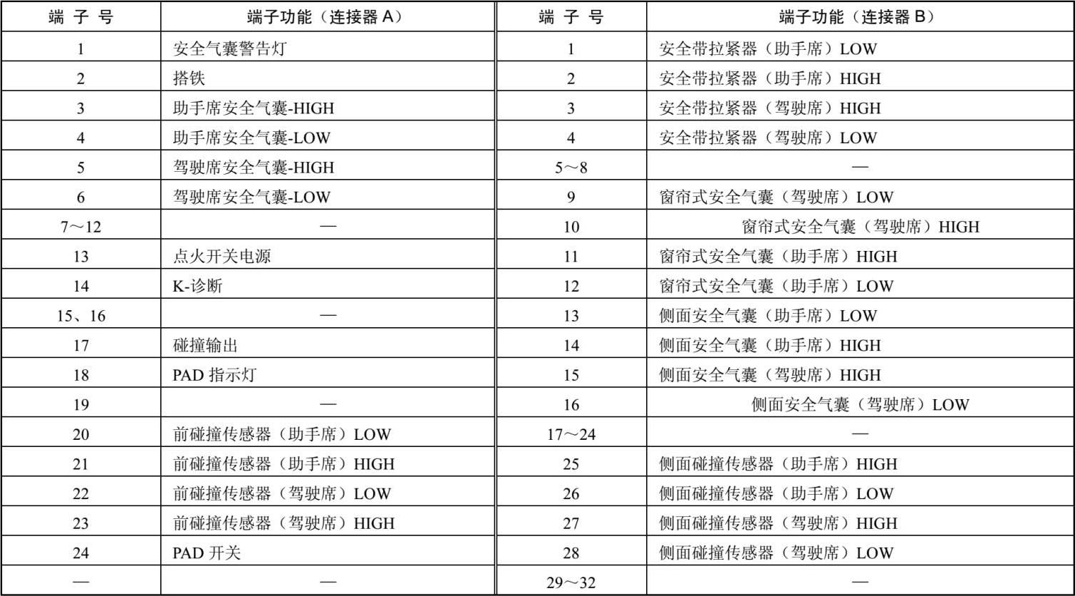 安全气囊系统电控单元(SRS)连接器如图1-15所示,其端子功能如表1-22所示。