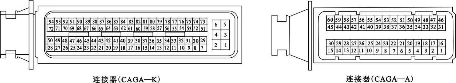 ECM线束连接器如图1-18所示。其连接器(CAGA—K)端子功能和检测数据如表1-25所示,连接器(CAGA—A)连接器端子功能和检测数据如表1-26所示。
