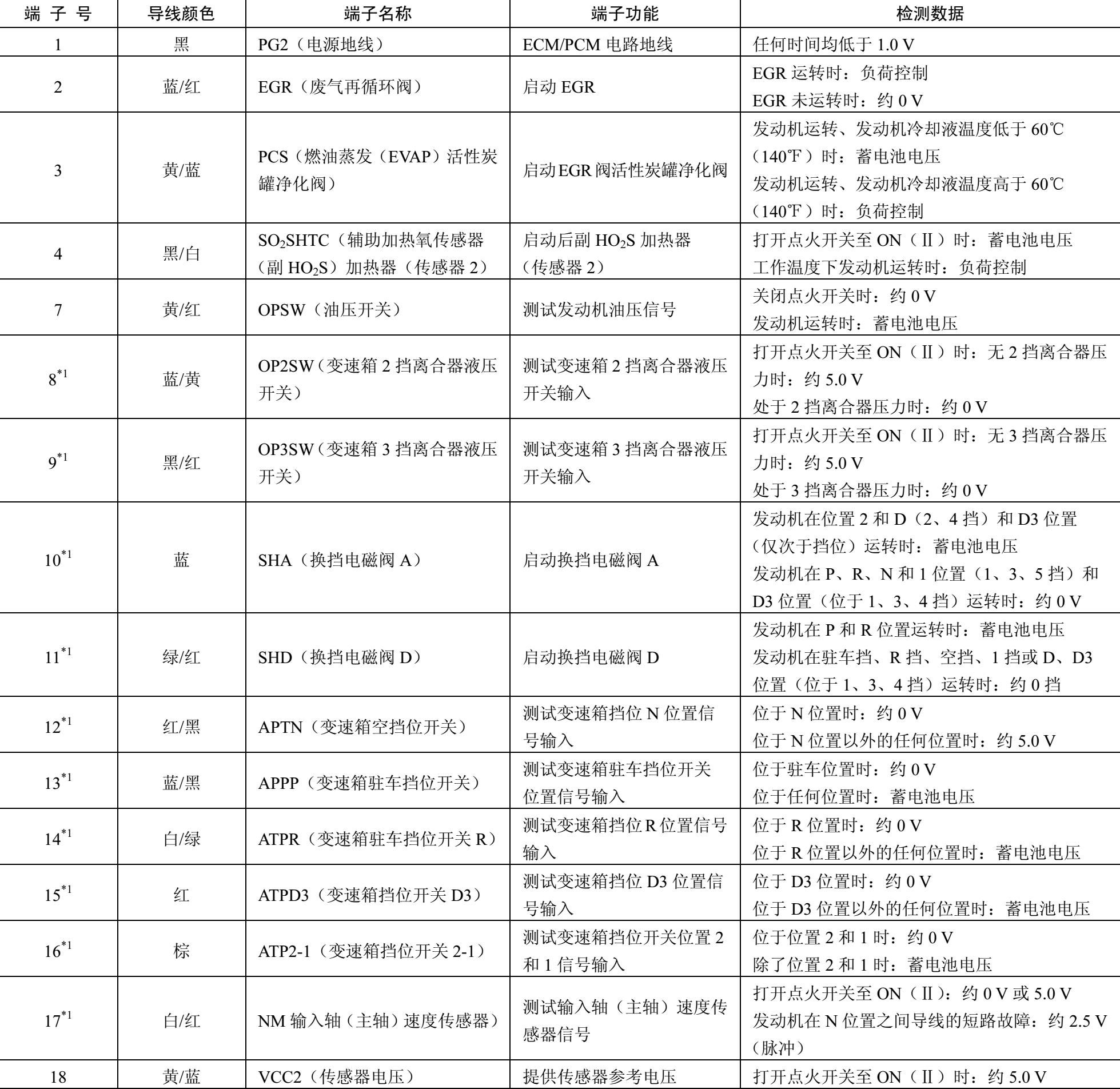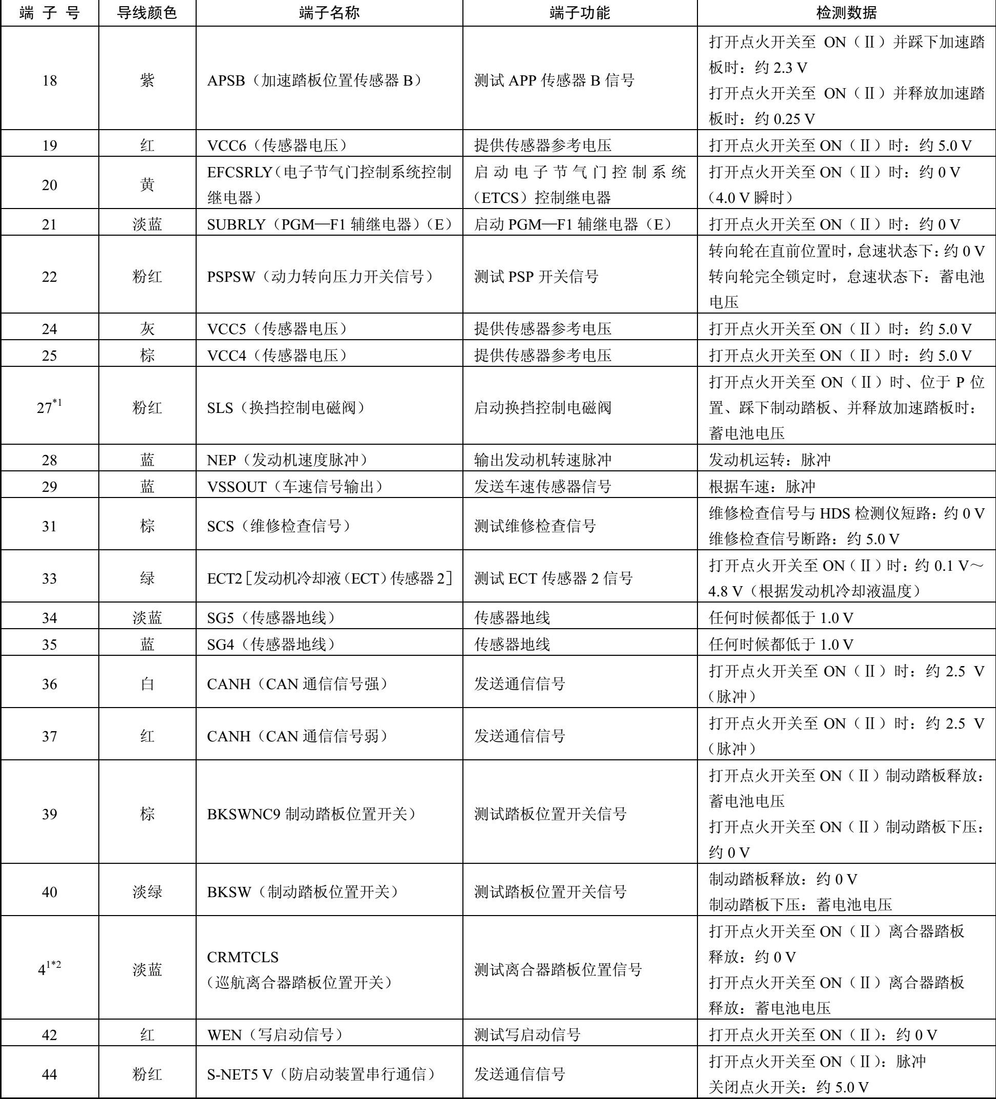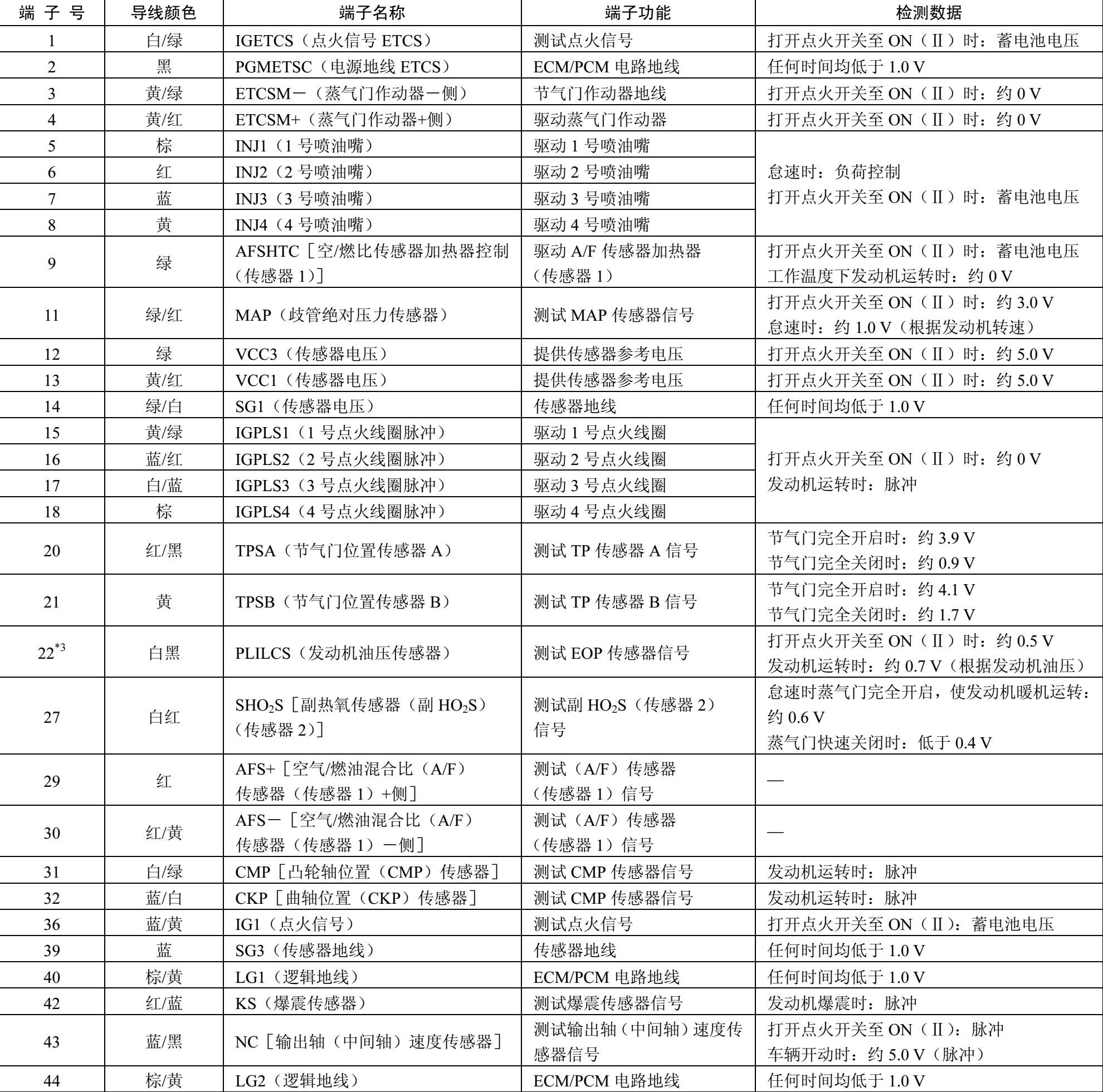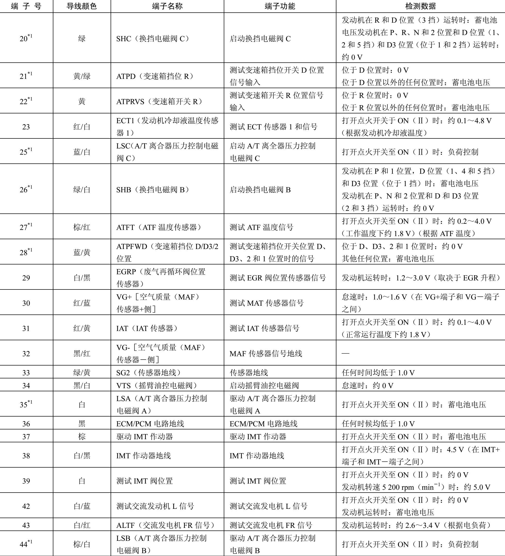 表2-1 连接器A(□)(44 P)处的ECM/PCM连接器端子功能和检测数据