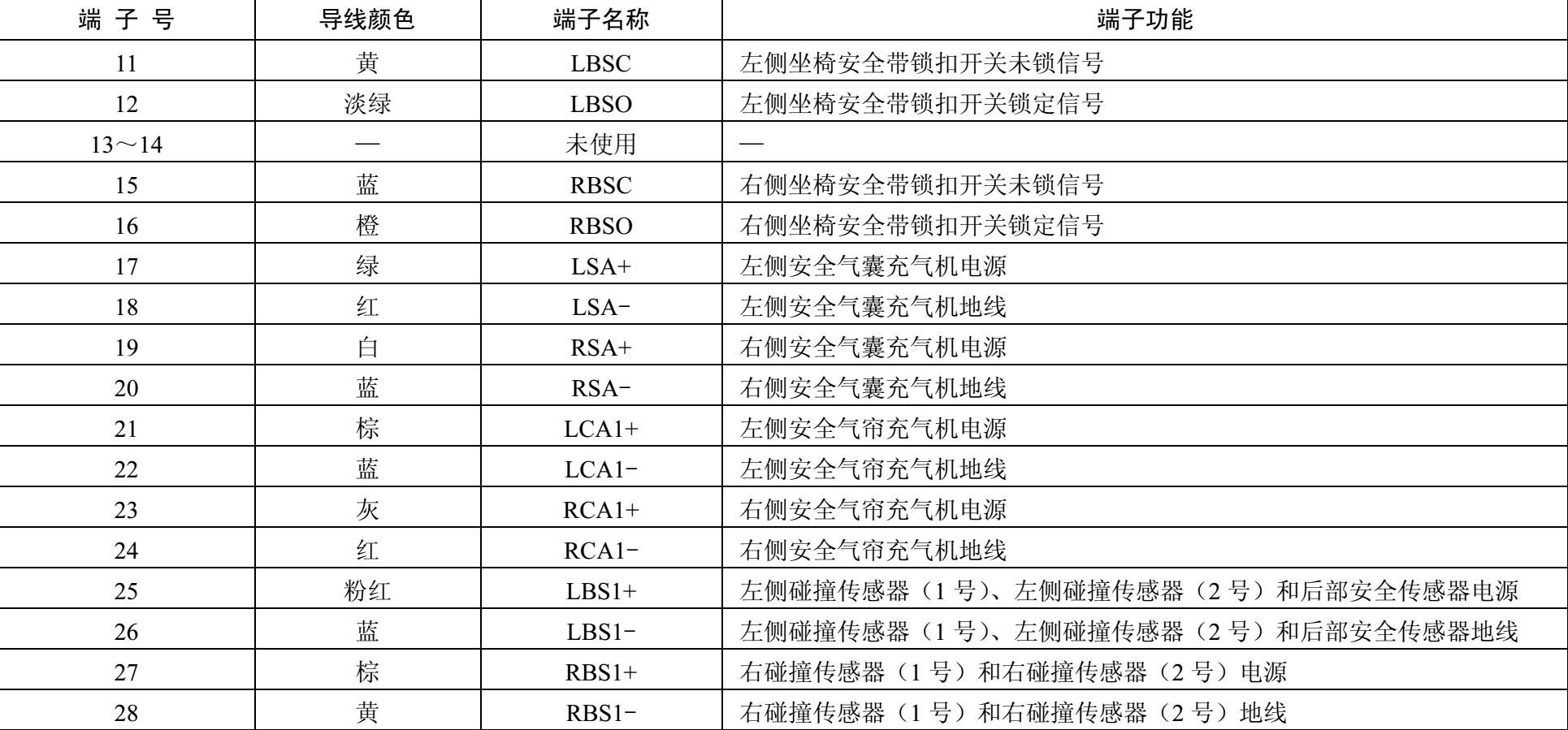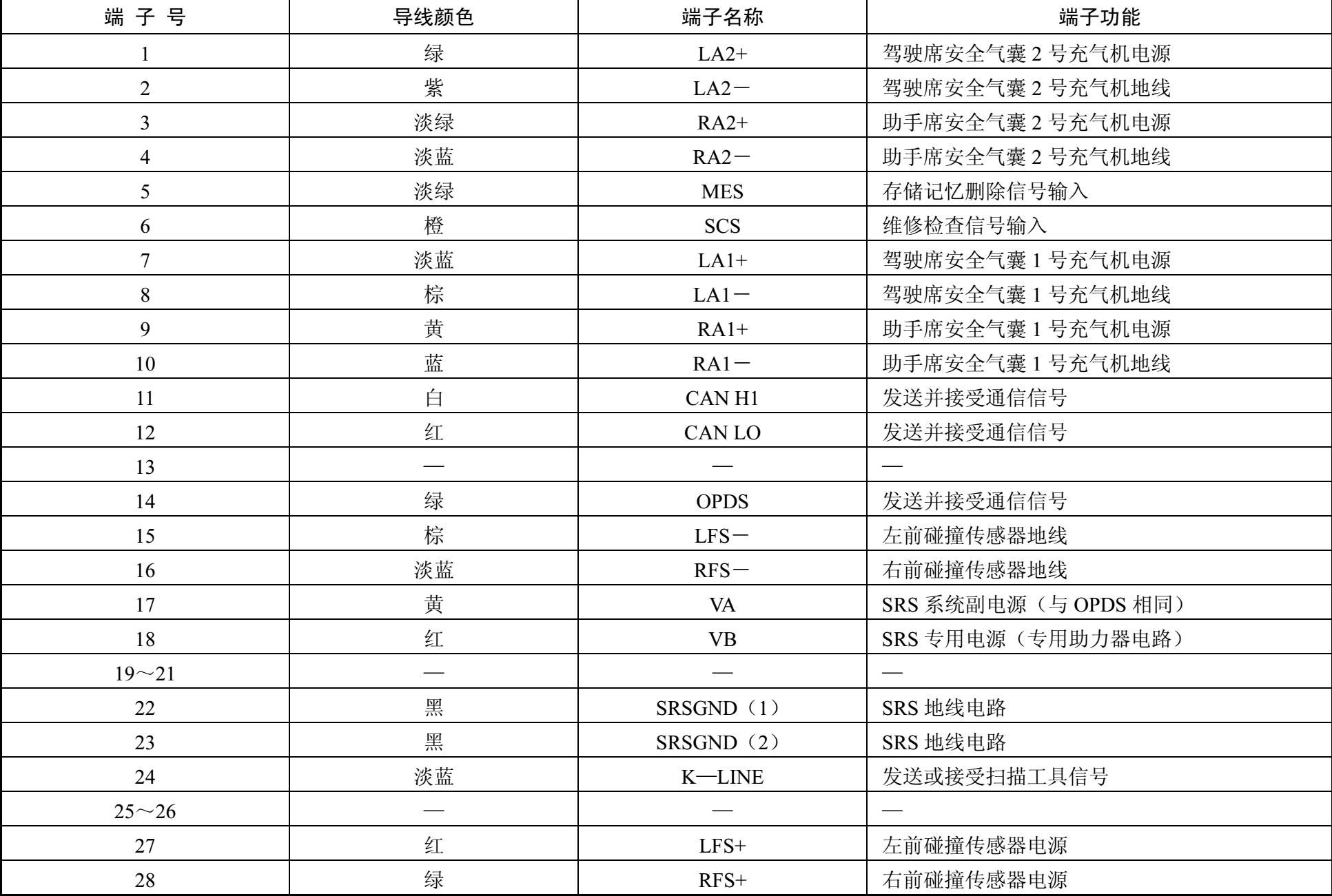 表2-5 SRS装置连接器A(28 P)连接器端子功能
