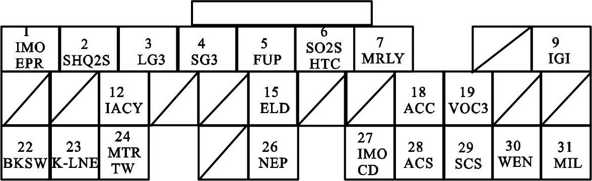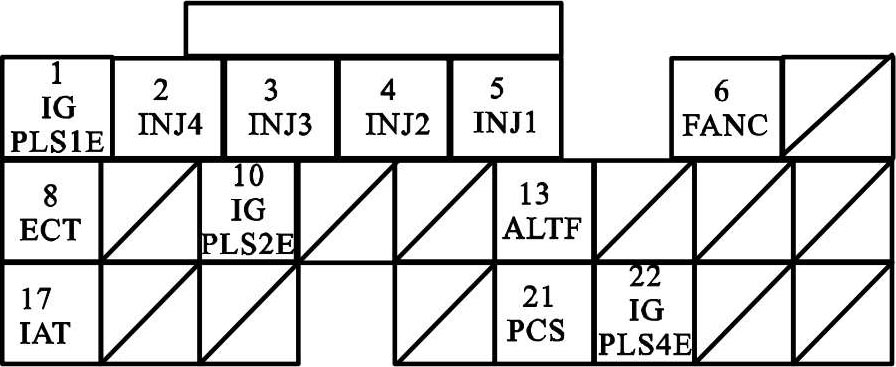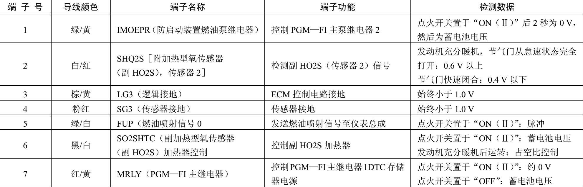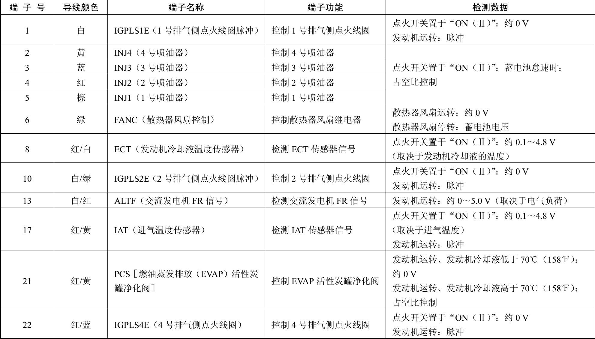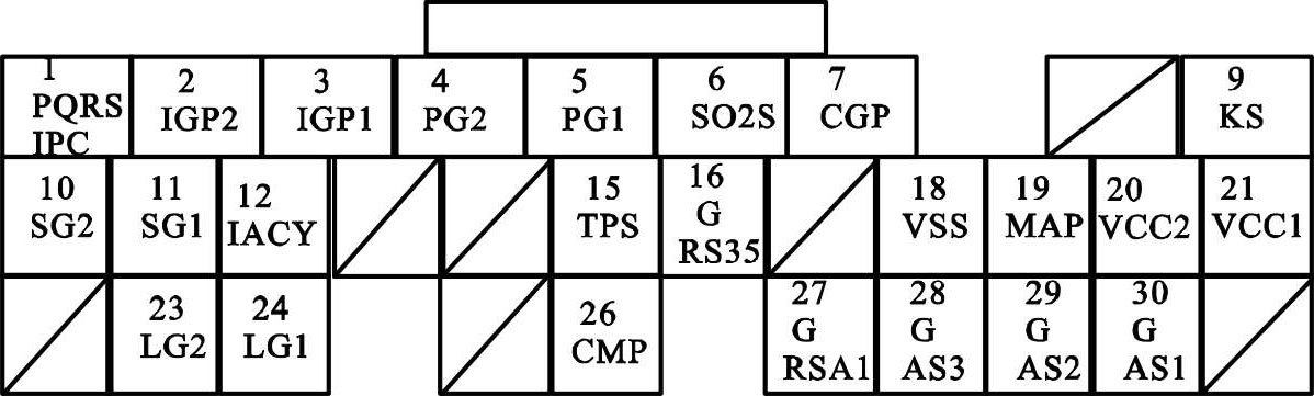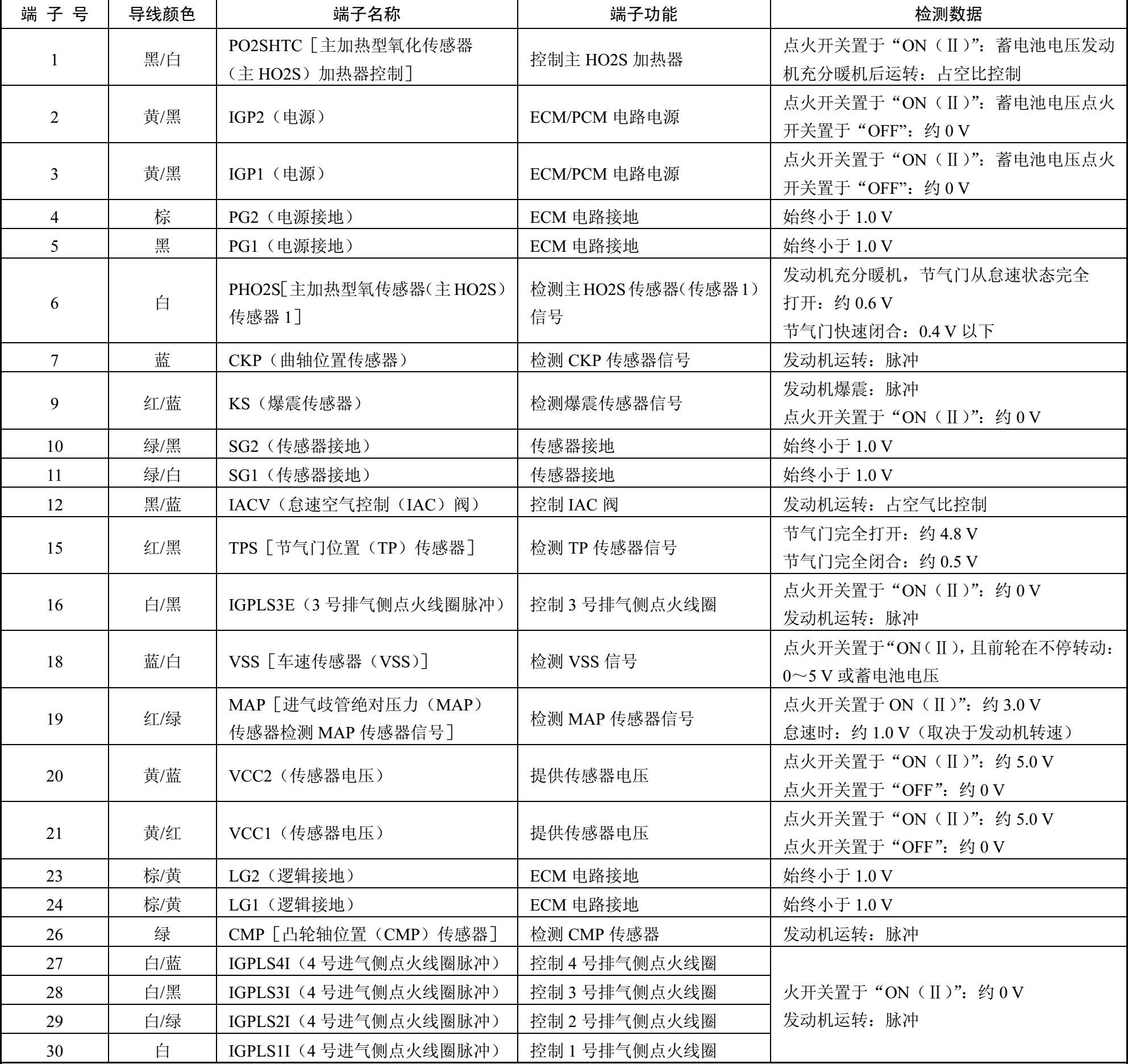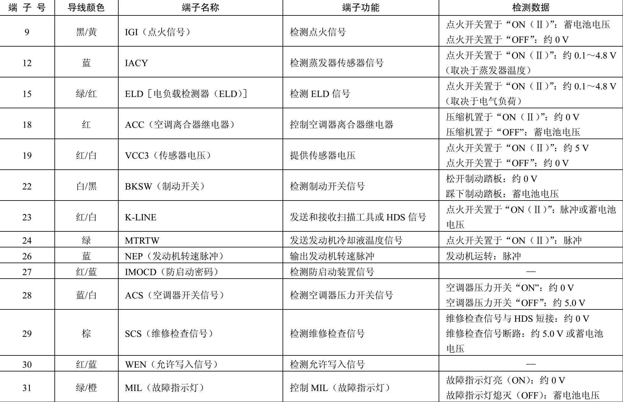 ECM电控单元连接器A(31P)如图2-22所示,连接器A(31P)的端子功能和检测数据如表2-26所示。
