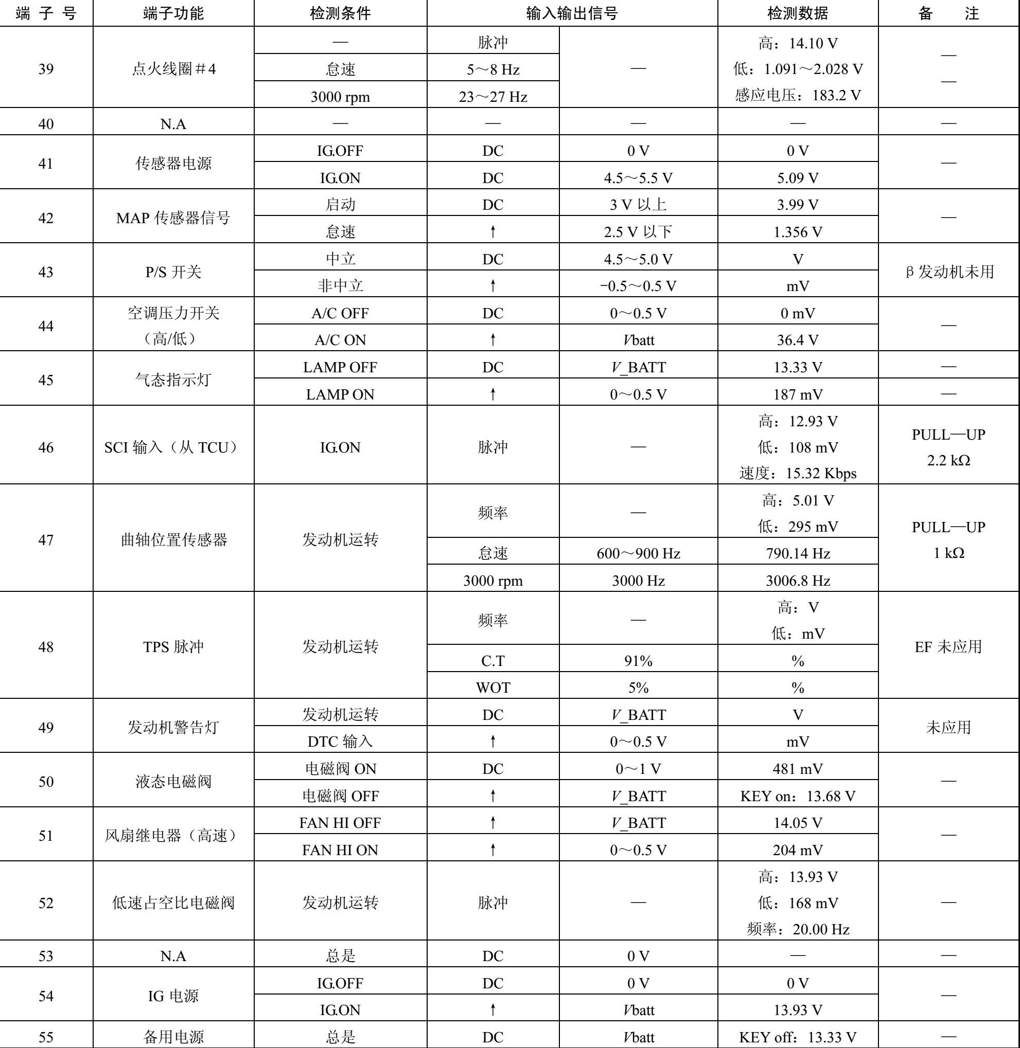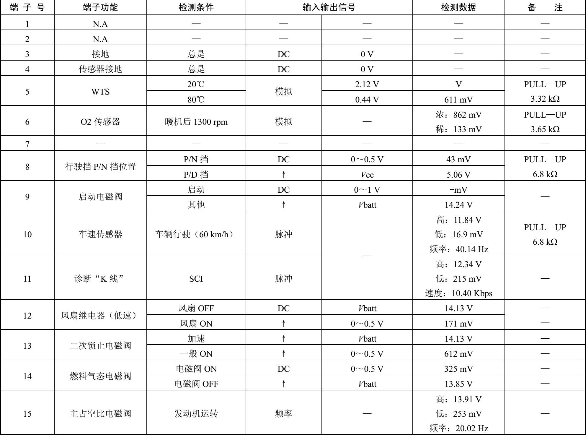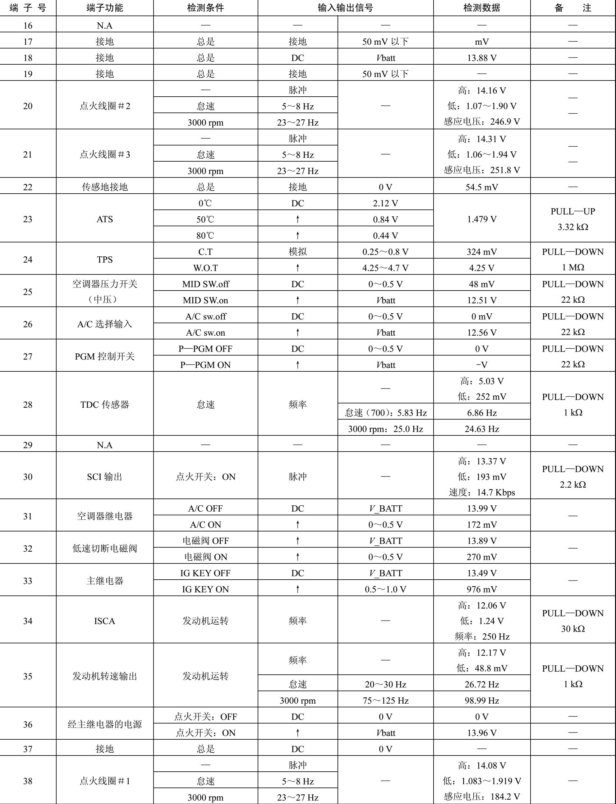 表1-1 发动机系统电控单元连接器端子功能和检测数据