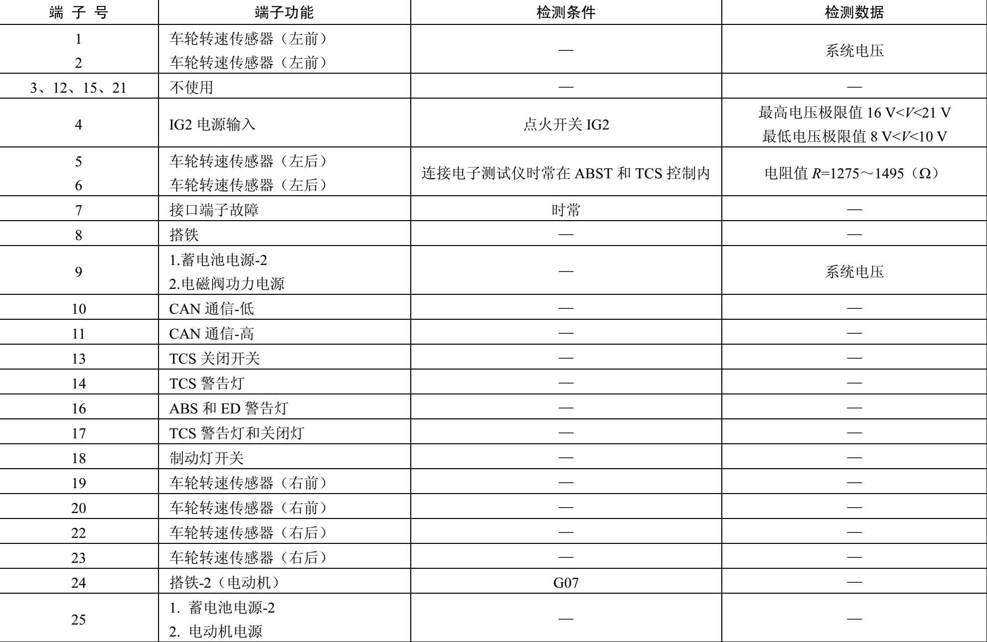 表1-2 HECU型防抱死制动液压系统电控单元端子功能和检测数据 0cYKCHF65Krx7lRpfLMWd1+yeH44u8wOT36WtMYQ7RWtm42Nmchl1yp9oCA/2rS0