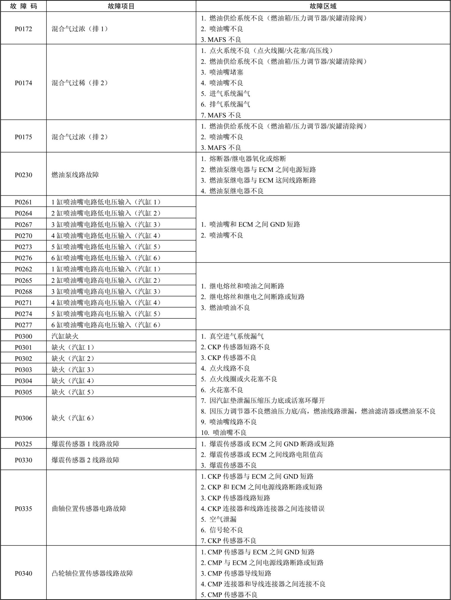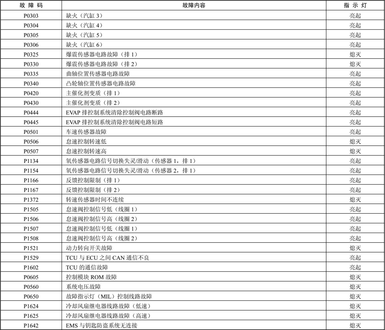 发动机控制系统2.4L4缸故障码如表1-14所示。