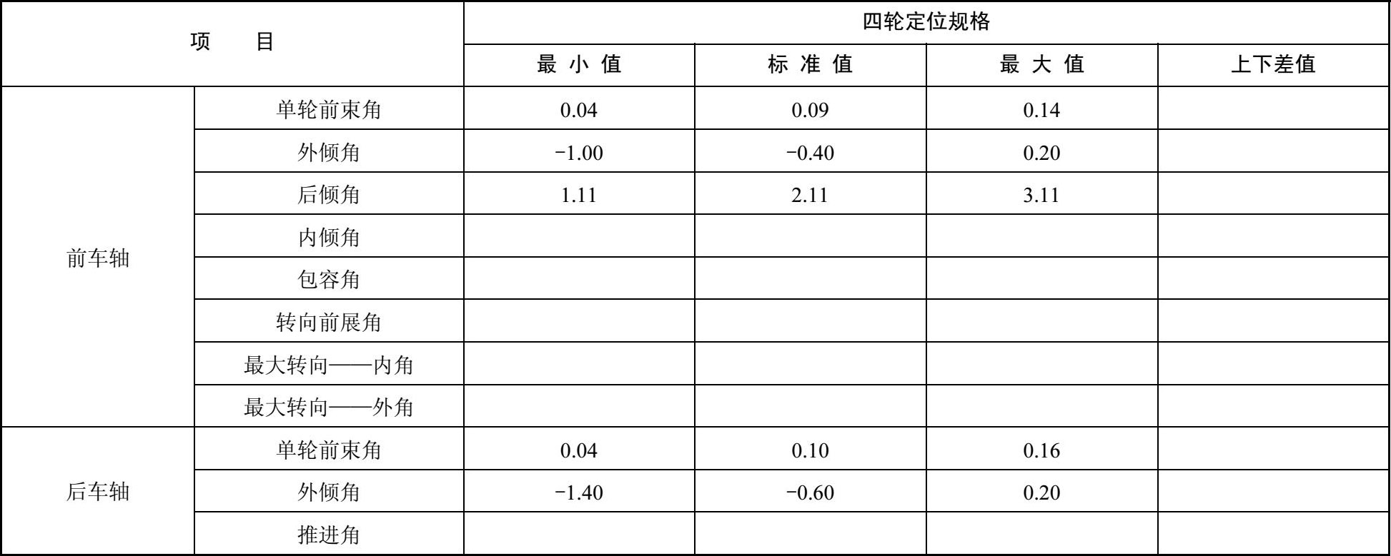 北京现代酷派新款型汽车四轮定位数据如表2-5所示。