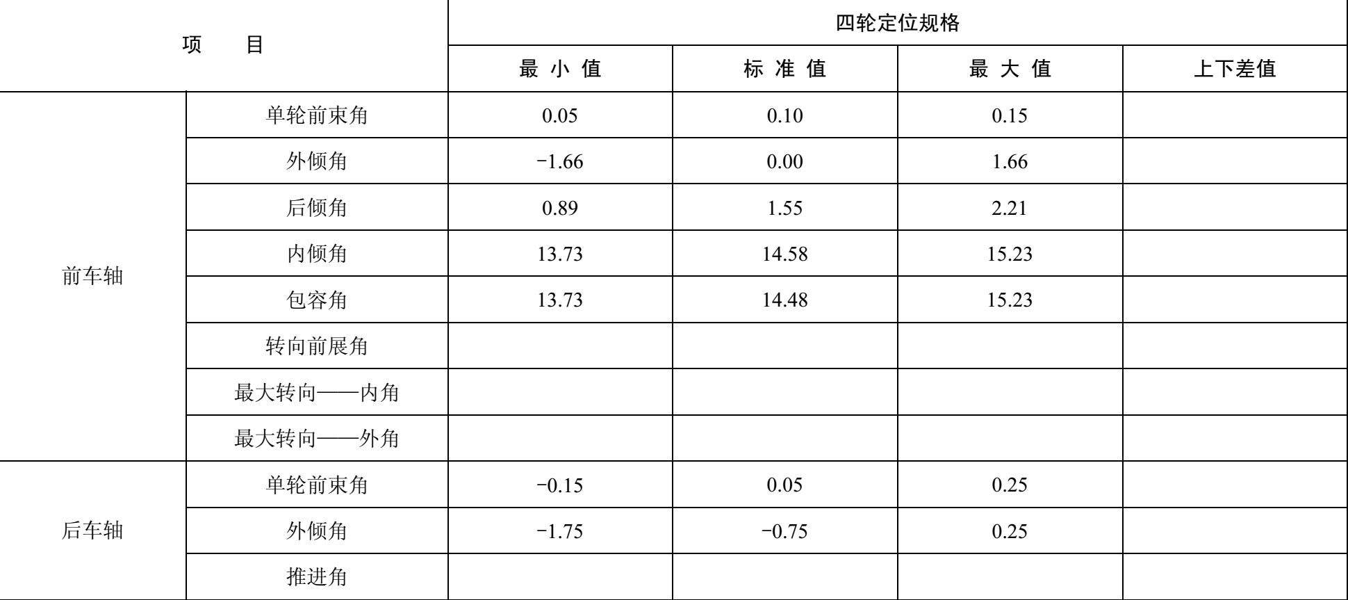 表1-1 东风日产蓝鸟LHD(SR18DE)185/70R13型汽车四轮定位数据