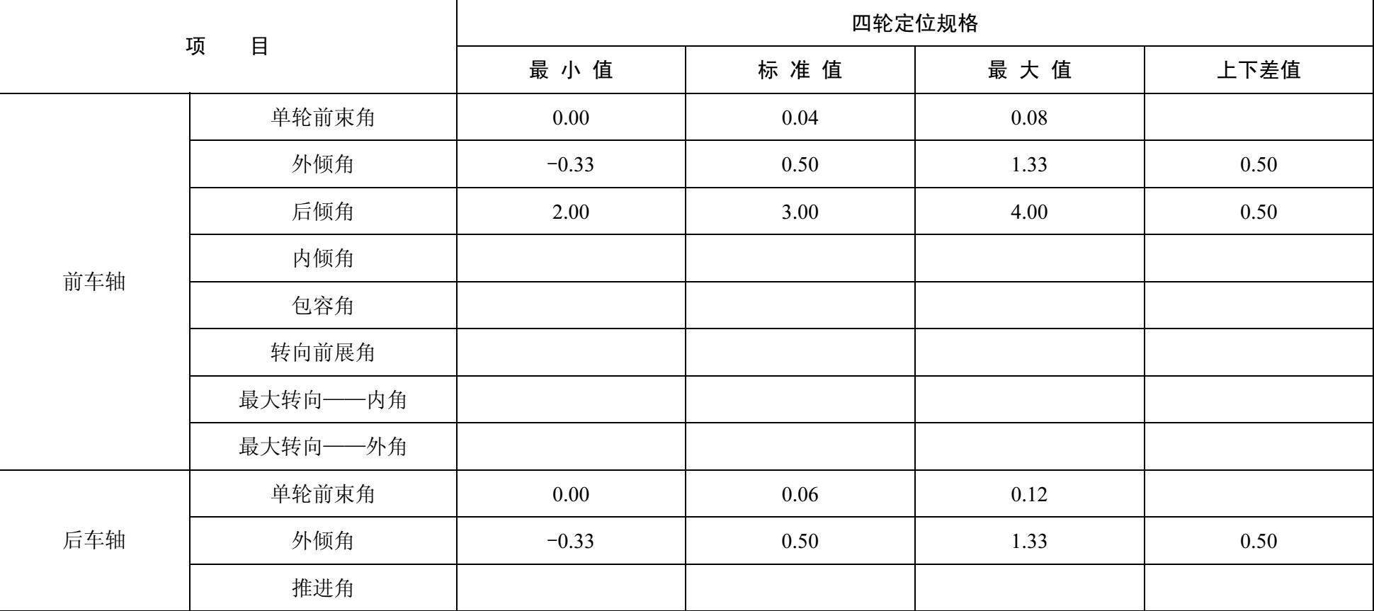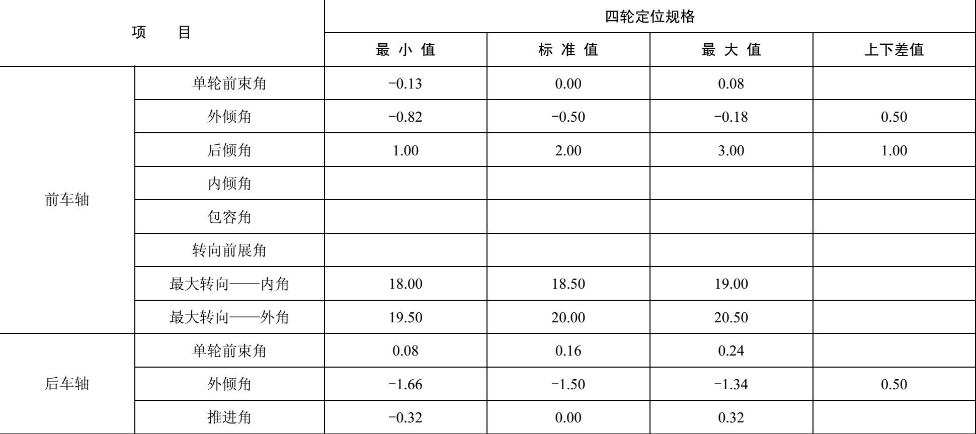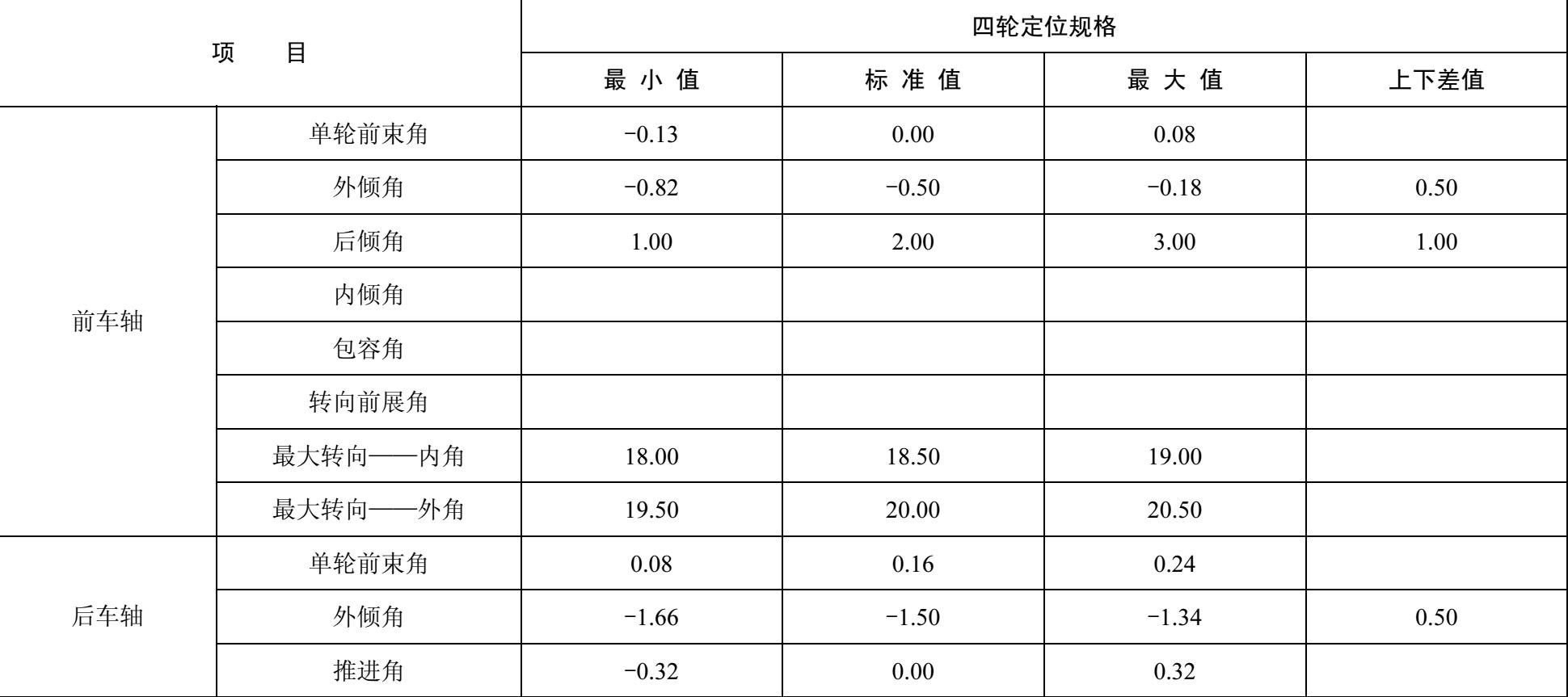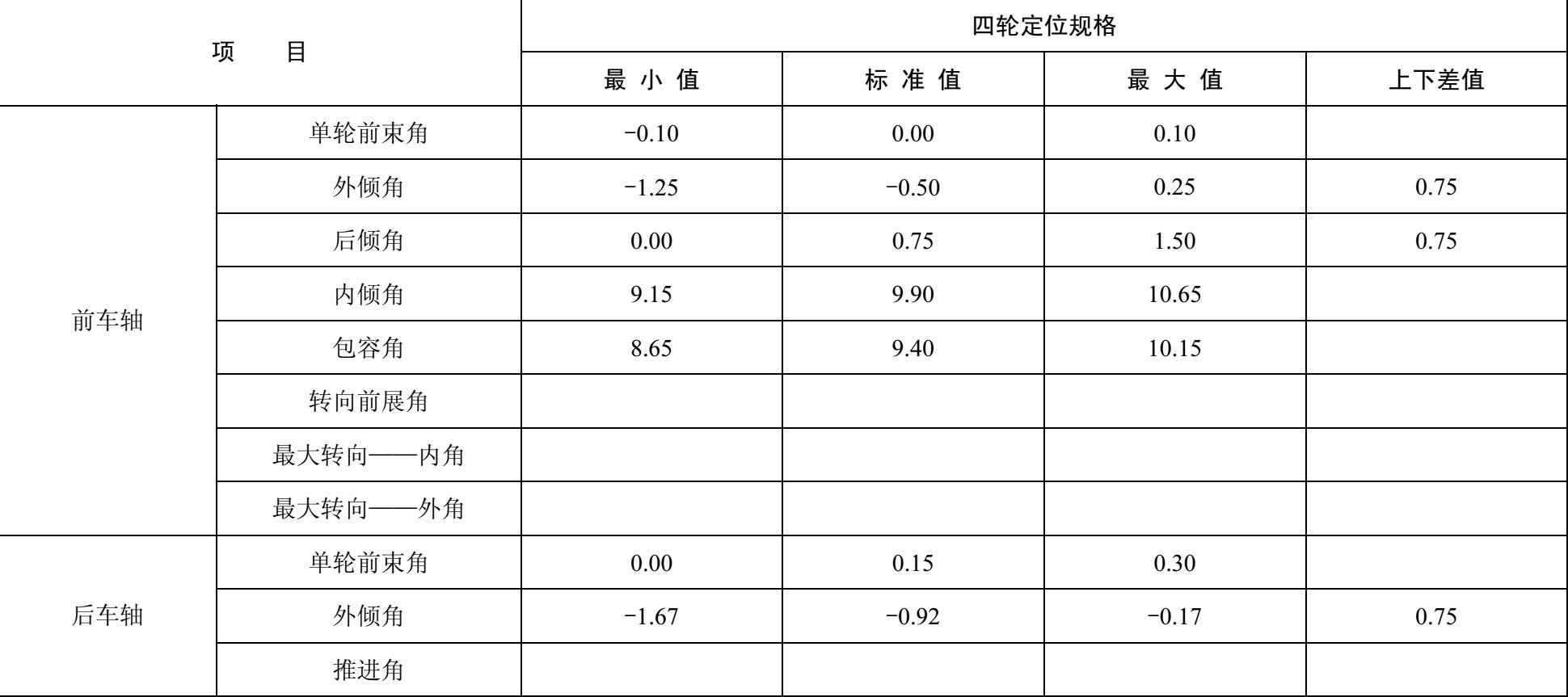 表1-121 一汽丰田特瑞两驱型汽车四轮定位数据
